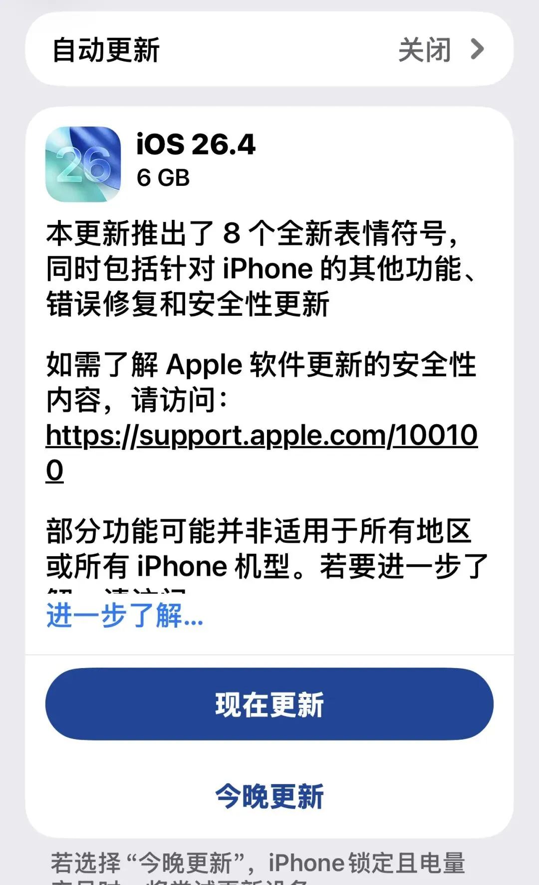 iPhone iOS26.4正式版3月25日凌晨更新,更新包大小604兆。