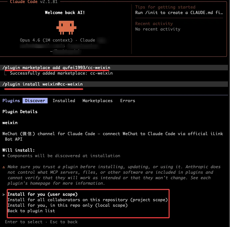 # 添加插件市场/plugin marketplace add qufei1993/cc-weixin# 安装插件/plugin install weixin@cc-weixin安装过程中会提示你选择作用域,直接选用户作用域就行。