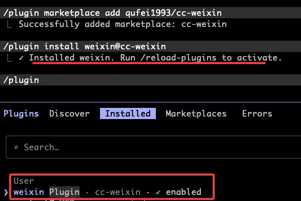 安装完成后,输入 plugin 命令检查一下。在 installed 列表里如果能看到 weixin,就说明装好了。