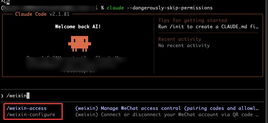 新窗口打开后,输入 /weixin,正常情况下你能看到两个子命令: