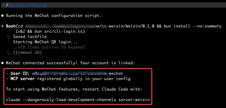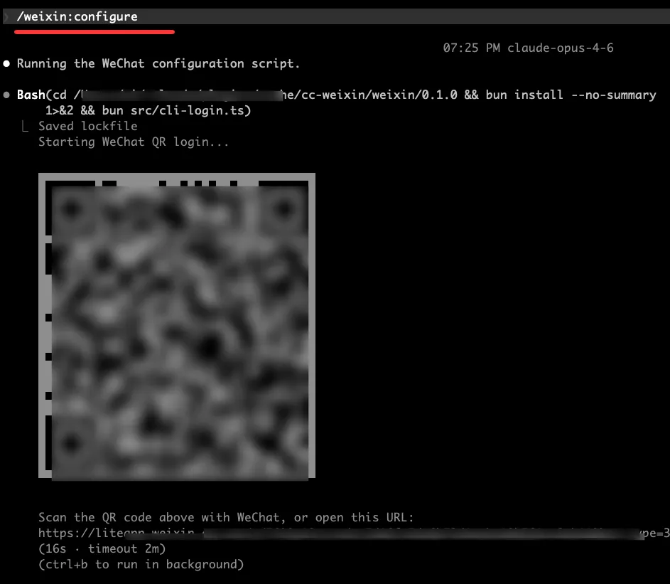 选择 /weixin:configure,回车执行。终端会生成一个微信二维码。默认可能是折叠状态,按 Ctrl + O 可以展开显示。