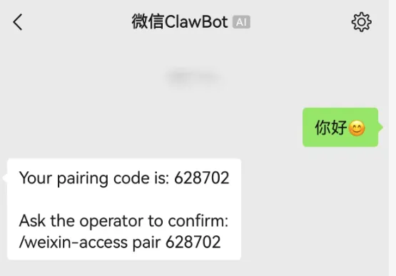 在微信好友列表里找到 微信 ClawBot,给它随便发一条消息。ClawBot 会自动返回一个 6 位数的配对码。