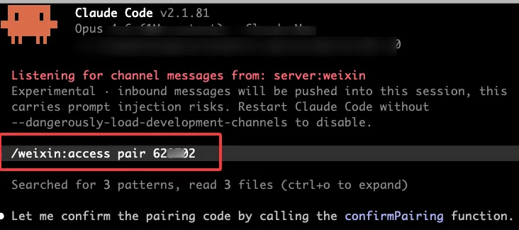 claude --dangerously-load-development-channels server:weixin(新版是 plugin:weixin@cc-weixin)这条命令会启动 Claude Code 的 channel 监听模式,让它实时接收微信发过来的消息。参数名字看着有点吓人,但只是因为这个功能目前还在实验阶段,不影响正常使用。