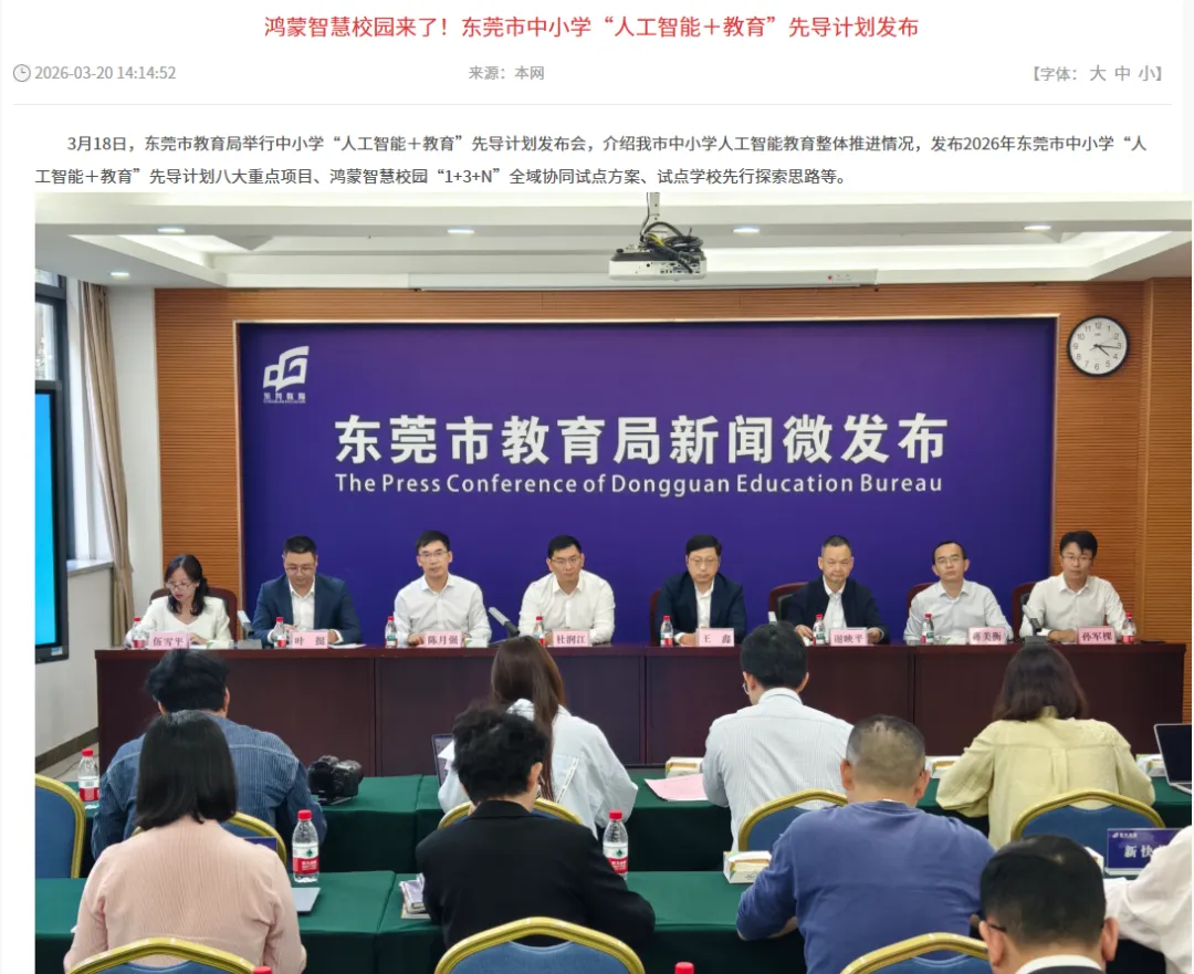 为深入推进教育数字化战略实施,加快构建现代化教育体系,3月18日,东莞市在广东省教育厅指导下,正式发布中小学“人工智能+教育”先导计划。该市携手华为鸿蒙生态,创新打造鸿蒙智慧校园“1+3+N”体系,全面落地八大智慧教育应用场景,致力建设全国领先的人工智能教育示范区,推动精准教学、个性化育人全域覆盖。