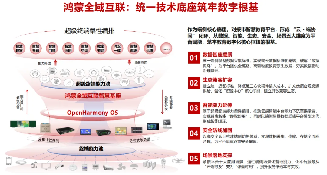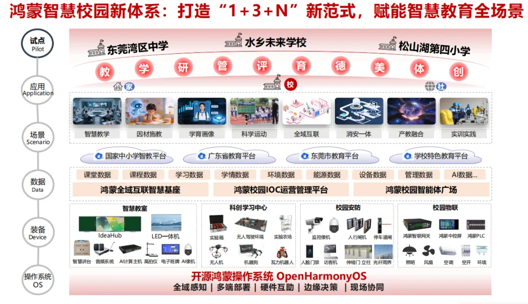东莞紧扣智慧校园建设实际需求,联合华为鸿蒙生态团队,科学搭建鸿蒙智慧校园“1+3+N”全域协同体系,形成层级清晰、权责明确、落地可行的建设框架,为智慧教育长效推进提供坚实保障。