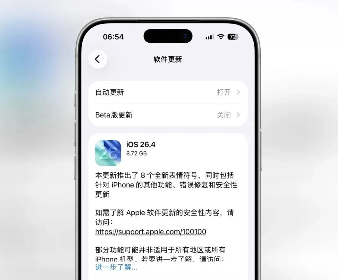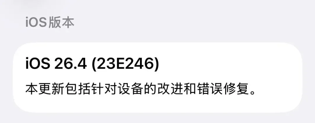 当然我们主要还是来看看 iPhone 用户们比较期待的 iOS 26.4 正式版,这次正式版的版本号是 23E246。与之前 RC 版的版本号不一致,所以之前已经升级了 RC 版的用户也是可以直接升级到 iOS 26.4 正式版的。iOS 26.4 正式版的更新日志有很多,可以说是一次大版本更新了,具体更新内容如下:优化 App Store 每次启动加载过慢问题,现在打开加载的速度快了很多。对用户登录界面再次进行重新设计,将 App 更新放到了单独的二级页面 ,有更新列表内会显示红点和数量提示 。现在 App Store 现在无法直接退出切换账号,需要在设置当中退出切换账号。经常切换账号的伙伴,只能进入 设置—Apple账户—媒体与购买项目—退出登陆,再重新登陆其他地区的账号。iOS 26.4 正式版 新增「环境音乐」小组件,可添加到主屏幕和锁屏。目前提供两种尺寸,方便快速播放白噪音。长按主屏幕空白处选择编辑,现在编辑菜单使用了更加透明的液态玻璃效果。并且在控制中心呼出菜单,也使用了更加透明的液态玻璃效果。在「设置」-「辅助功能」-「显示与文字大小」,新增了一个「减弱明亮效果」 的开关,开启后即可减弱高亮效果。未开启时液态玻璃的高亮边缘和菜单背景渐变非常明显,滑动渐变效果。开启减弱之后边缘淡化了许多,菜单背景色也没有了渐变效果,显得暗了许多如下:Apple Music 新增了「你附近的音乐会」功能,可以查看所在地区的演出和喜欢的艺术家的巡演日期。这次还重新设计了 Apple Music 的专辑和播放列表外观,如查看专辑或歌单时,背景会根据封面自动适配,使用了整页的艺术作品,体验更加沉浸。增加了 8 个新的 emoji 表情符号,包括扭曲脸、小号、毛茸茸的生物、宝箱、战斗云、虎鲸、芭蕾舞者和山崩,并且可以正常显示了。芭蕾舞者一共有 6 种肤色,扭曲脸是非常无奈非常有意思的表情。iOS 26.4 Beta 4 改进了系统墙纸逻辑,现在部分系统墙纸默认不下载,仅保留 iOS 26 和 iPhone 17 Pro Max 壁纸。其他系列壁纸可根据自己的需求进行下载,下载后也可以从图库移除,可以更好地节省手机存储。无边记图标已经更换为深色风格,内部也做了调整,后续版本可能会加入更多功能。在提醒事项应用中,新增了一个「紧急」的模块,进入之后可以直接创建紧急的提醒。这次还重新设计了 Apple Music 的专辑和播放列表外观,如查看专辑或歌单时,背景会根据封面自动适配,使用了整页的艺术作品,体验更加沉浸。「面容ID与密码」,输密码界面,终于把左边对齐,改回了居中显示,这下真的舒服了。除了以上肉眼可见的更新内容之外,iOS 26.4 正式版还存在大量更新和优化:iOS 26.4 正式版加入了减弱明亮效果,一定程度会减少发热和续航。如果你已经更新了 iOS 26 系统的话,还是比较建议更新到 iOS 26.4 正式版的。如果你所在的系统使用挺好的,没啥问题,可以选择不更新。iOS 18 的用户继续保持所在的系统,不建议升级。