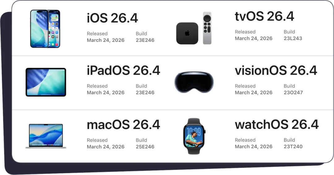 苹果在今天 3 月 25 日凌晨向用户正式推送了 iOS 26.4 正式版系统更新,同时到来的还有 iPadOS 26.4、macOS 26.4、watchOS 26.4 等一系列系统更新。
