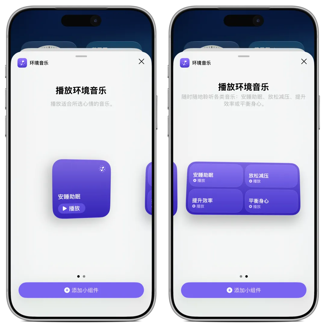 iOS 26.4 新增「环境音乐」小组件,可添加到主屏幕和锁屏。目前提供两种尺寸,方便快速播放白噪音。