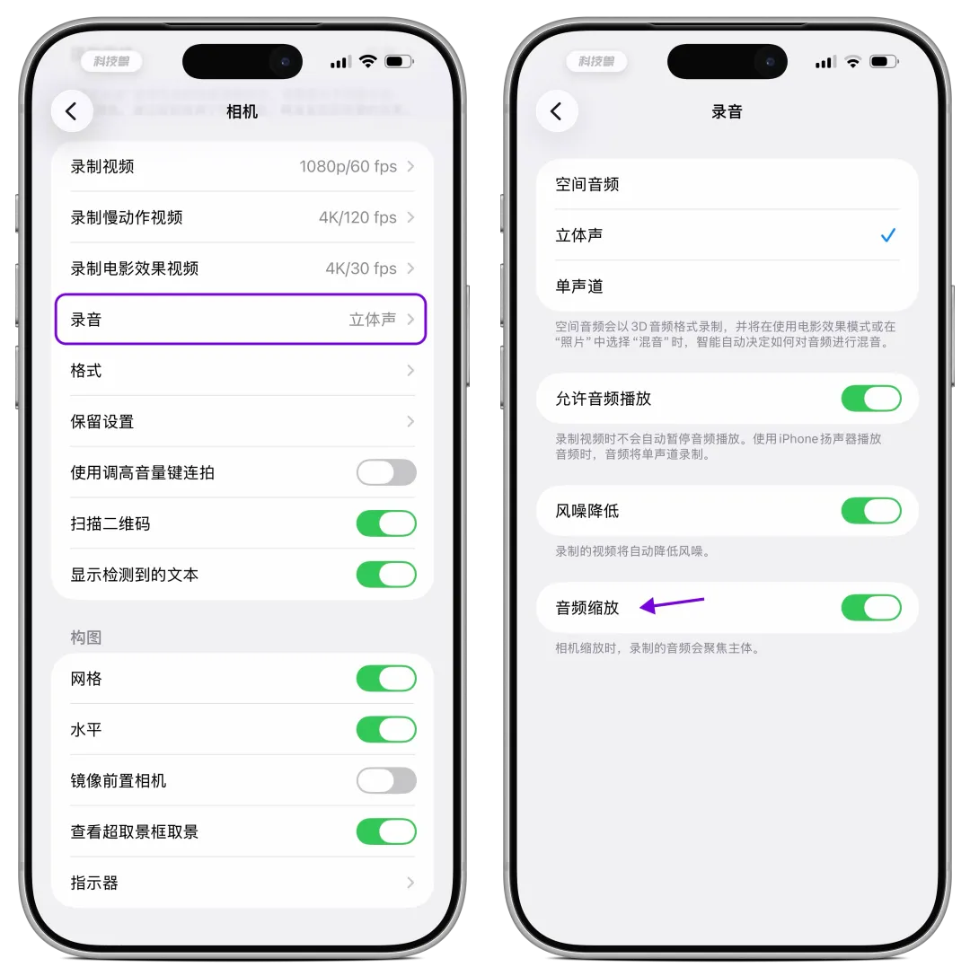 iPhone 相机设置里面,「录音」设置新增了「音频缩放」开关。现在可以手动关闭视频拍摄时的音频缩放功能,避免在拉近镜头时背景杂音被异常放大。
