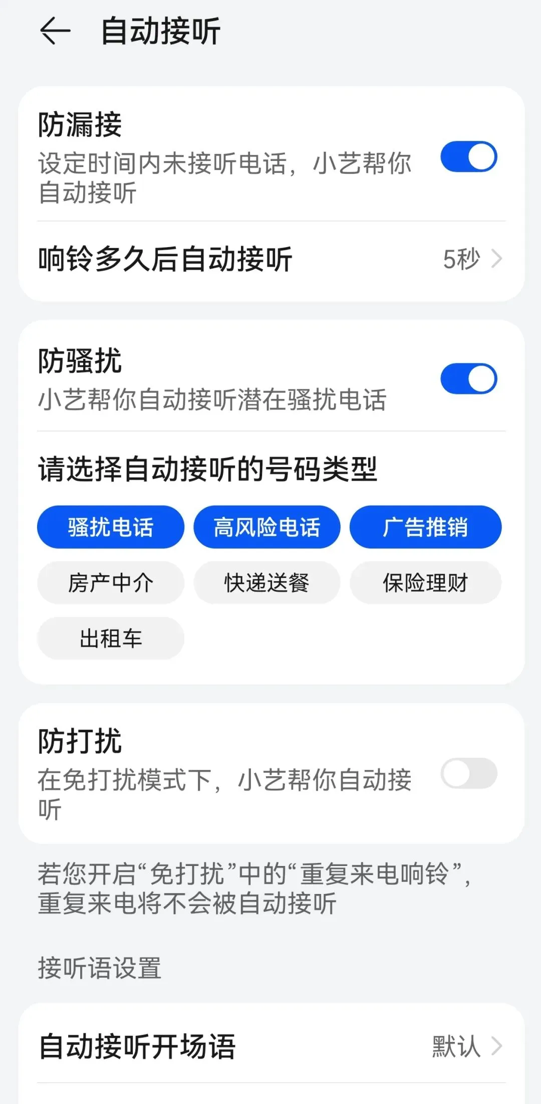 开启「防漏接」,设定响铃5秒后自动接听(时间可自定义)。比如开会、赶地铁没法接电话时,小艺会帮你接听,还能把对方留言转成文字,回头看就行,再也不怕“没接到重要电话”!② 防骚扰+精准拦截:骚扰电话“自投罗网”