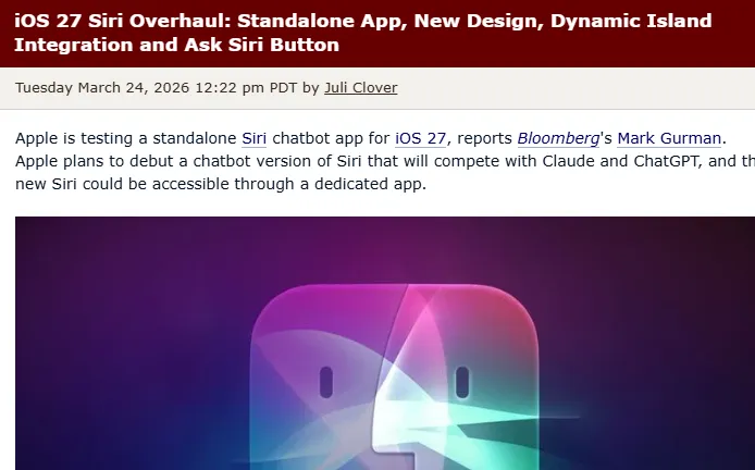 【环球网科技综合报道】3月25日消息,据彭博社报道,苹果正为iOS 27测试全新Siri,将推出独立应用,结合全新设计、动态岛集成及“询问Siri”按钮,全面升级以对标ChatGPT、Claude等主流AI聊天机器人。