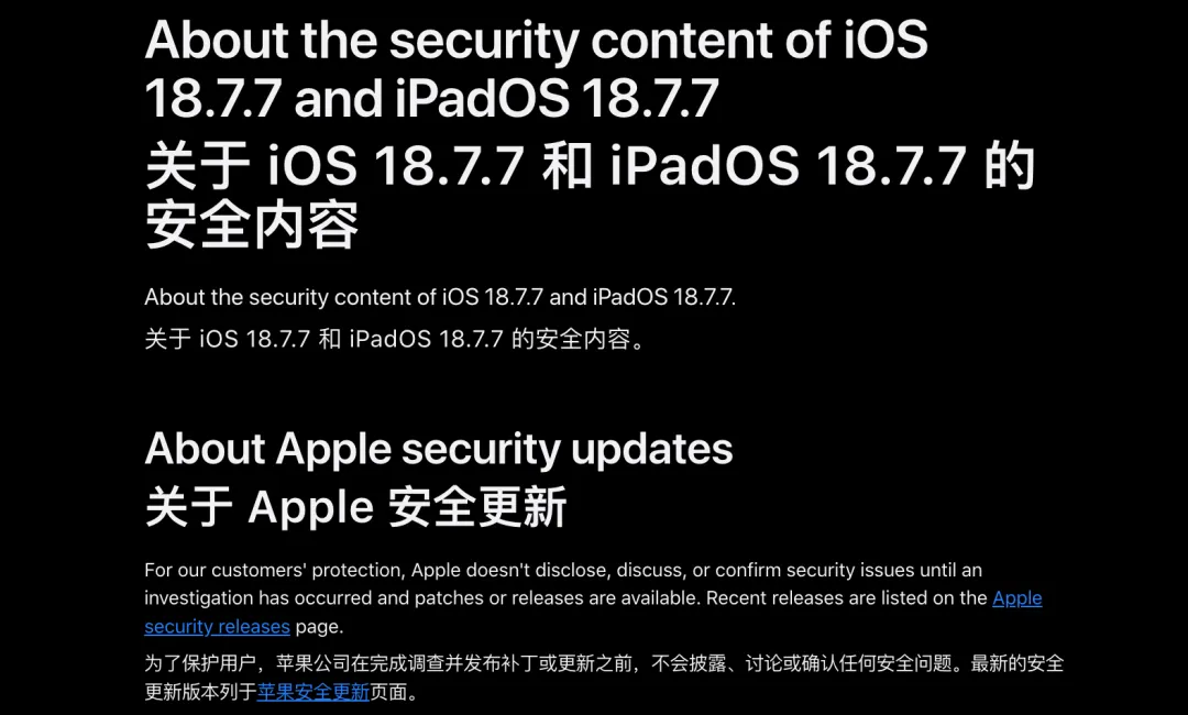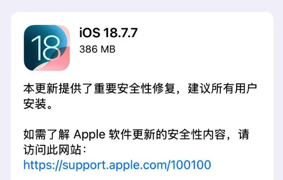 3月25日,苹果向特定iPhone老机型推送iOS 18.7.7正式版,截至今日下午,已有不少手持老机型的用户反馈收到更新提醒。此次更新定位为老机型专属安全维护版,无新增功能,核心聚焦漏洞修复与系统稳定性优化,为无法升级至新一代系统的设备筑牢安全防线。