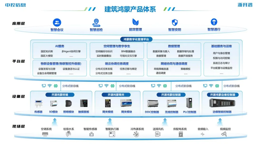 作为中控信息承接开源鸿蒙业务主体的全资子公司,浙开鸿肩负着推动OpenHarmony在建筑行业深度落地的重要使命。浙开鸿深度融合开源鸿蒙技术与建筑行业需求,推出开源鸿蒙传感器、开源鸿蒙控制器、开源鸿蒙物联网平台等产品,并在2026年正式推出建筑鸿蒙智控解决方案。方案以“AI+开源鸿蒙智控产品”为核心,构建了“南向兼容-数字基座-北向统一”的三层统一数字底座,实现设备、系统、数据的标准化统一。