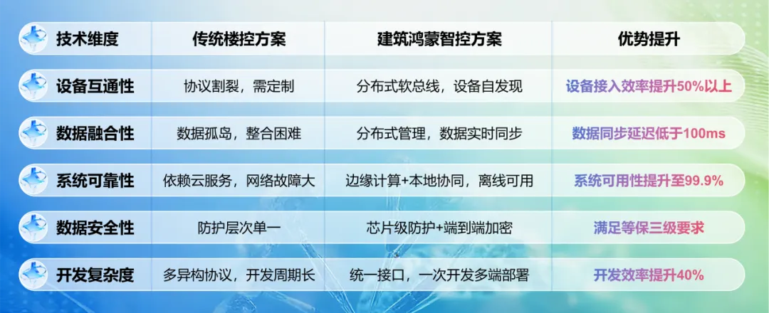相比传统楼控方案,建筑鸿蒙智控解决方案以OpenHarmony为统一底座,通过分布式软总线、统一数据模型等核心技术特性,实现建筑内多设备、多系统的无缝协同。
