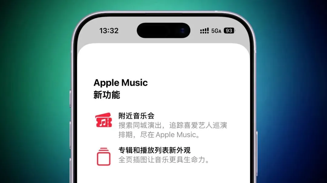 Apple Music 播放列表和专辑页面会自动匹配封面的色彩,提供全屏背景。新的「附近音乐会」功能可以找到所在地区的演出,追踪喜欢艺人巡演排期。