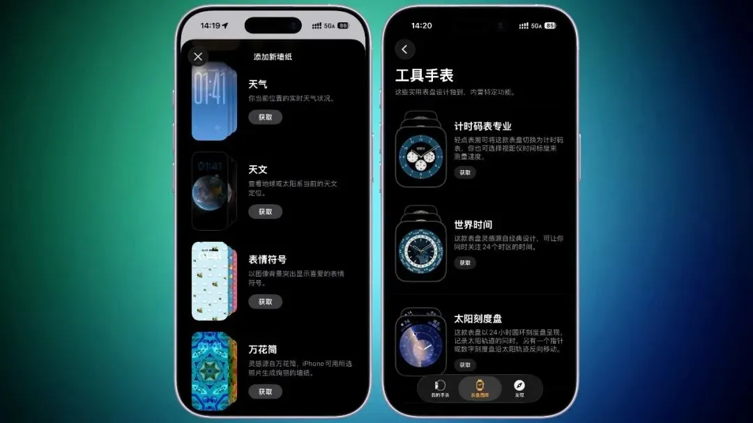 壁纸图库和 Watch 应用里的表盘图库采用了更新后的设计,用户可以将各类壁纸下载到 iPhone 上。