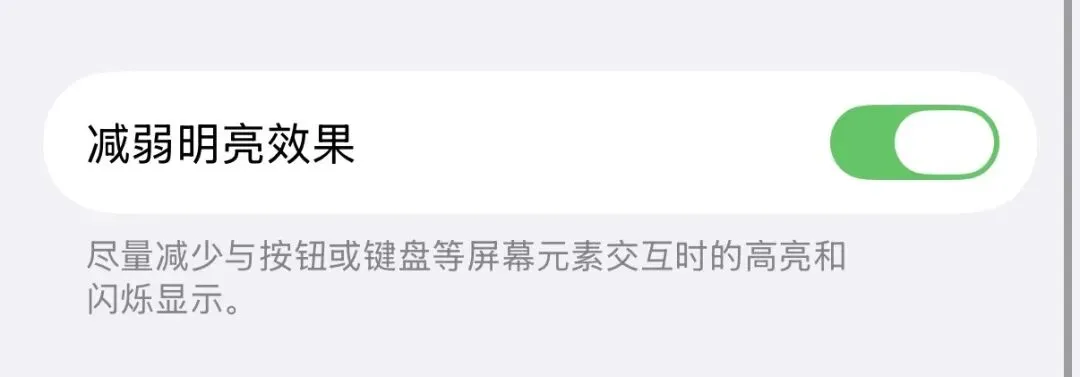 “设置”app - 辅助功能 - 显示与文字大小选项里新增「减弱明亮效果」开关,可以减少与按钮或键盘点触时的高亮和闪烁显示。