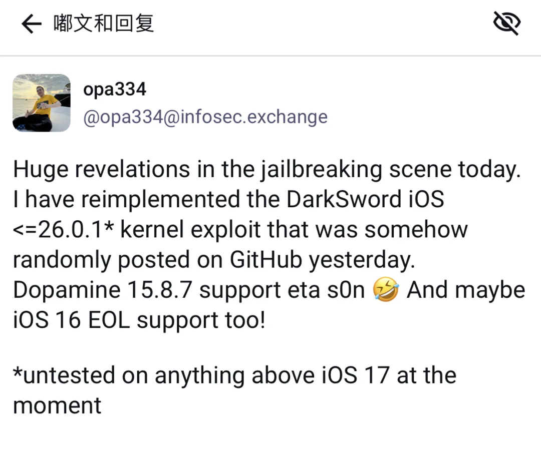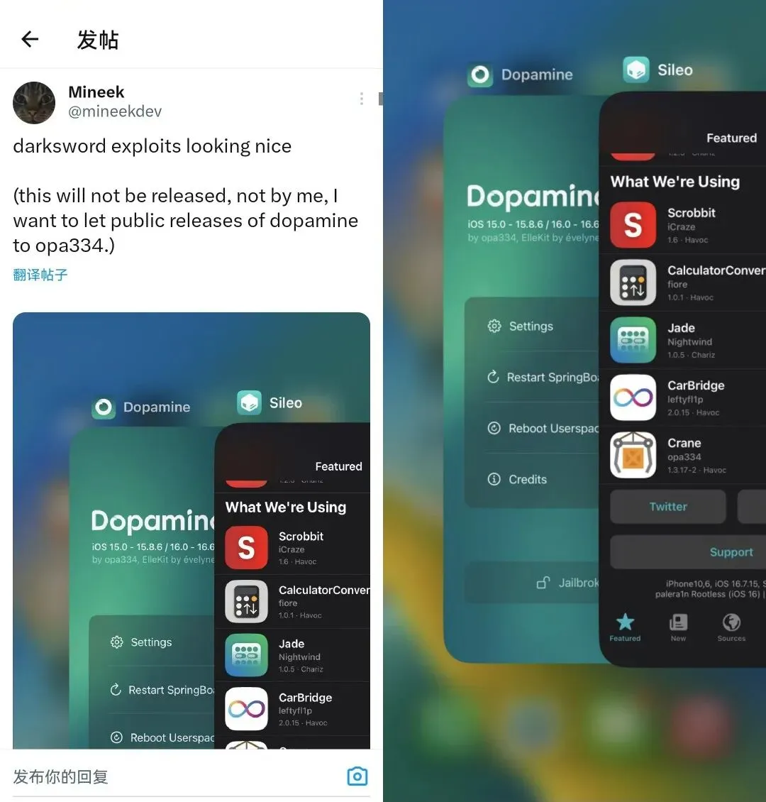 Mineek 称,自己不会公开这份成果,至少不应由他对外发布,他希望将 Dopamine 的正式发布权限交由 opa334。