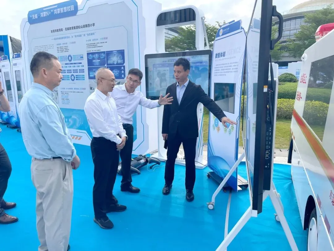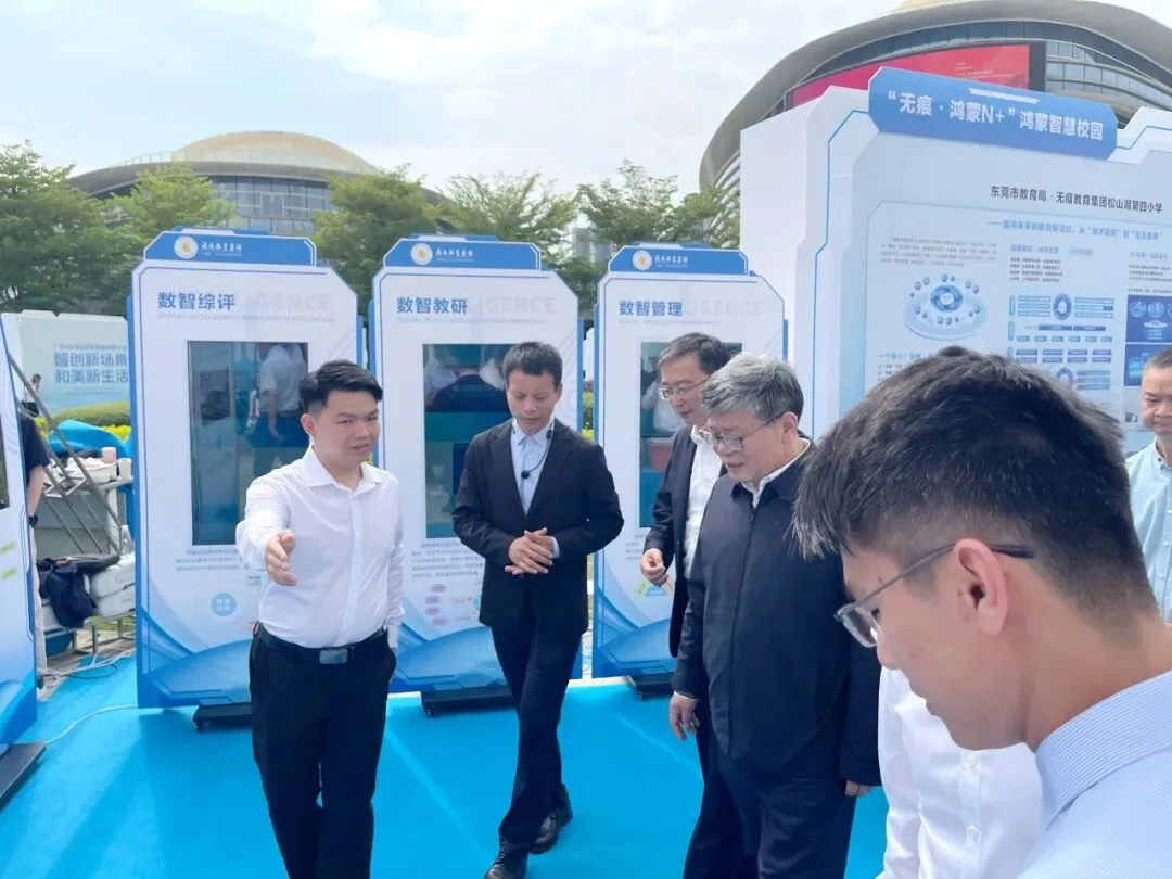 全国政协委员、中国经济体制改革研究会会长郭兰峰,广东省发改委主任龚桢梽一行,在东莞市委书记韦皓及市教育局党组书记、局长叶淦奎等陪同下,驻足展位,在科技作品与智慧大屏前,认真听取了学校关于“无痕·鸿蒙N+”智慧教育生态的汇报,对学校的创新实践给予了高度评价。