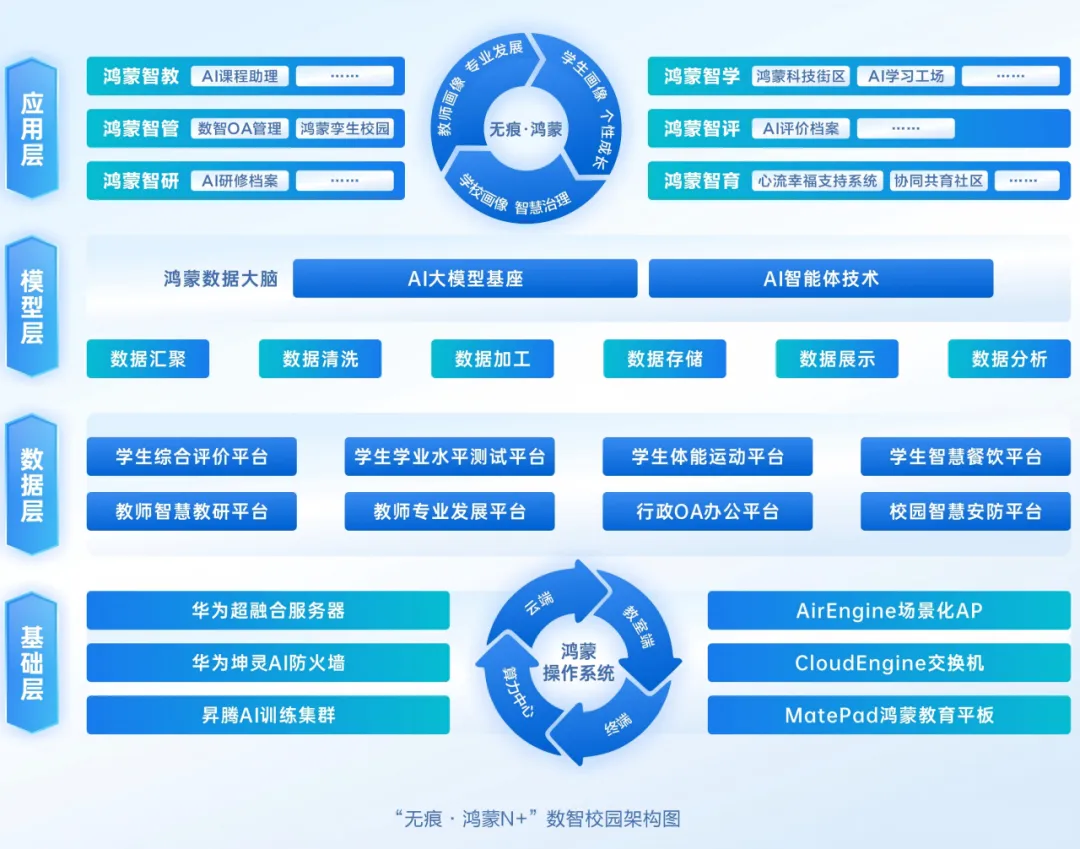 学校以“无痕·鸿蒙”为核心,深度融合无痕教育“润教育于无声”的育人理念与鸿蒙系统“融万物于互联”的技术特性,构建起“基础、数据、模型、应用”四层架构。