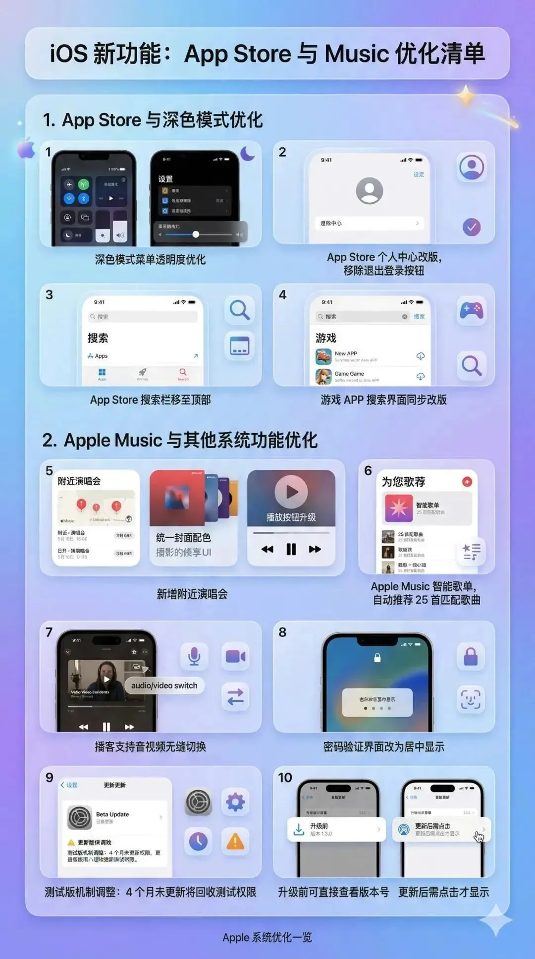 自带的音乐APP还新增了一个“查看附近演唱会”的功能,方便大家关注自己喜欢的演出。在支持Apple智能的设备上,当你新建一个播放列表时,系统还会自动推荐合适的歌曲,更加智能好用了。