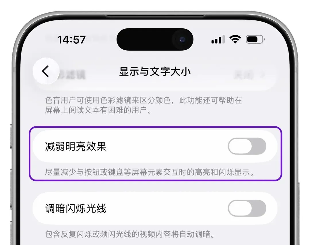 在「设置-辅助功能-显示与文字大小」中,新增了「减弱明亮效果」功能。