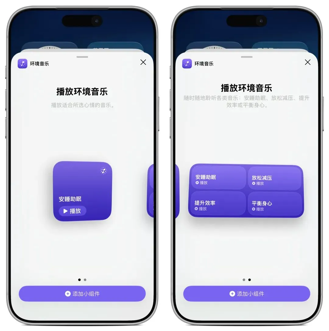 新增专属的「环境音乐」小组件,支持添加到主屏幕和锁屏界面,目前提供两种尺寸可选,一键就能快速播放白噪音,对需要专注工作、助眠的用户非常实用。