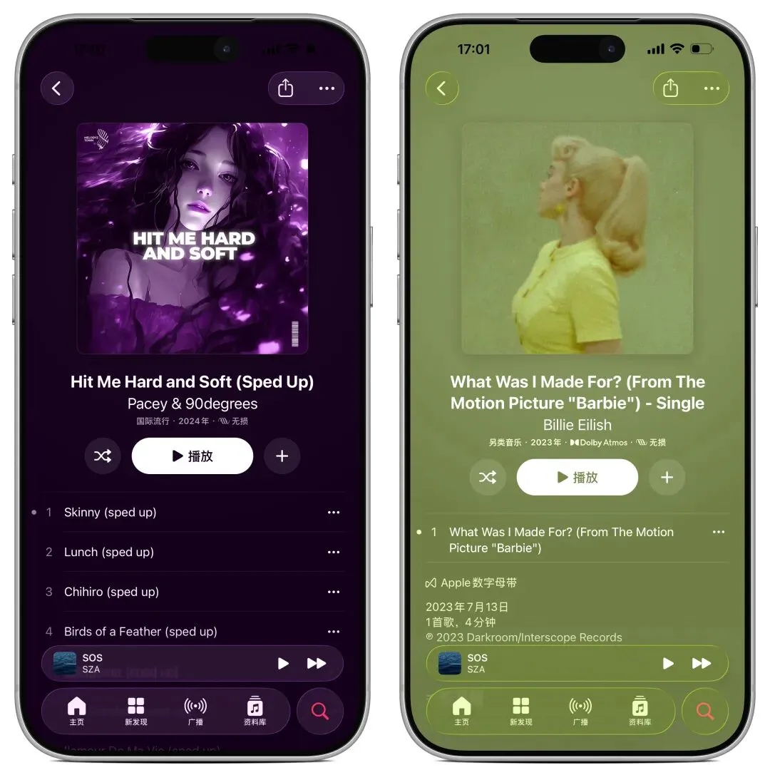 ◦ 查看专辑、歌单时,页面背景会根据封面主色调自动适配,视觉沉浸感大幅提升;