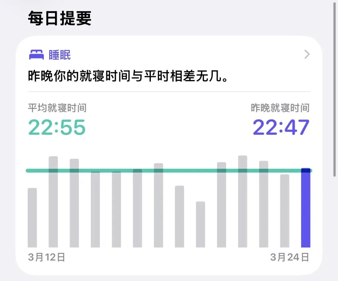 睡眠监测新增「平均入睡时间」统计,会通过过去两周的数据,分析你实际入睡时间和设定目标的偏差,帮你更好地调整作息。