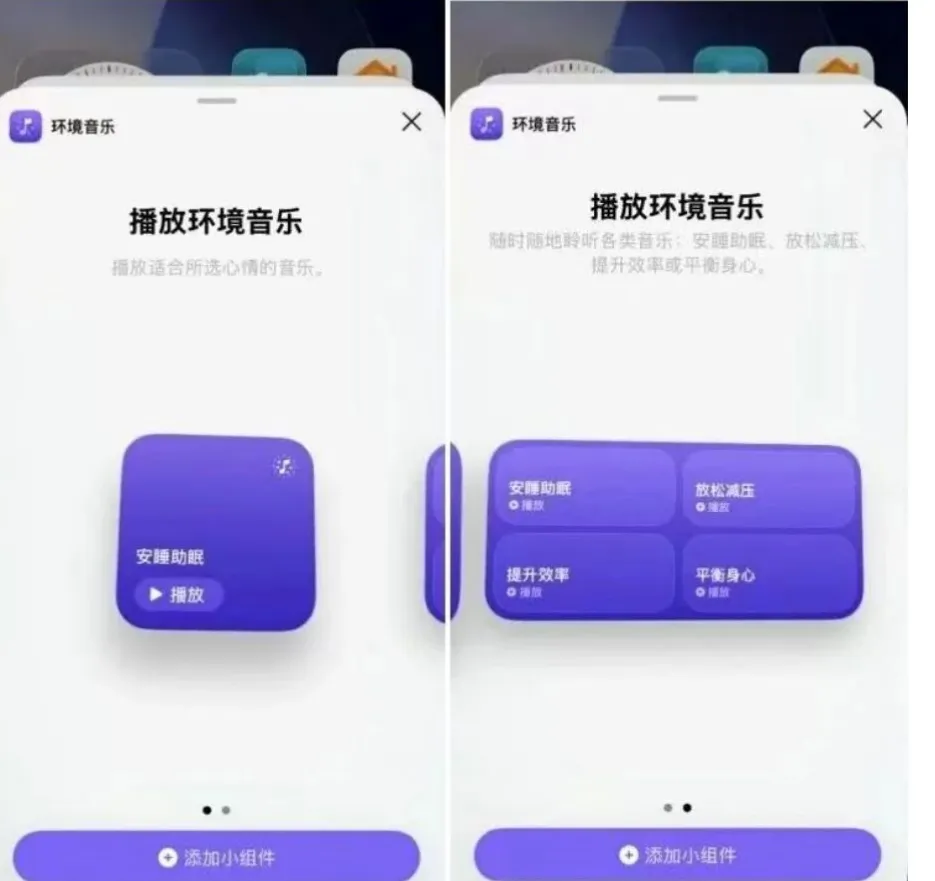 主屏幕新增的环境音乐小组件同样实用,支持添加到主屏和锁屏,提供两种尺寸及四种心情模式,轻点即可播放对应场景的白噪音或音乐,无需繁琐操作,既能屏蔽外界干扰,也能为高压环境下的用户提供情绪慰藉,不过该功能仅限Apple Music用户使用