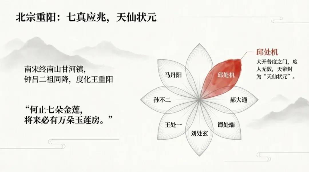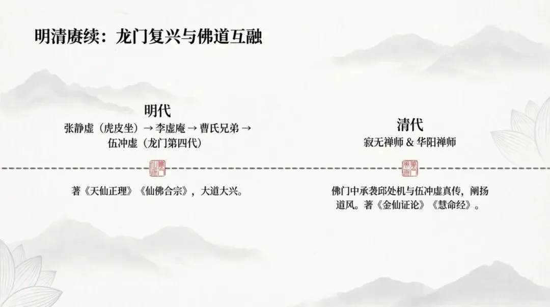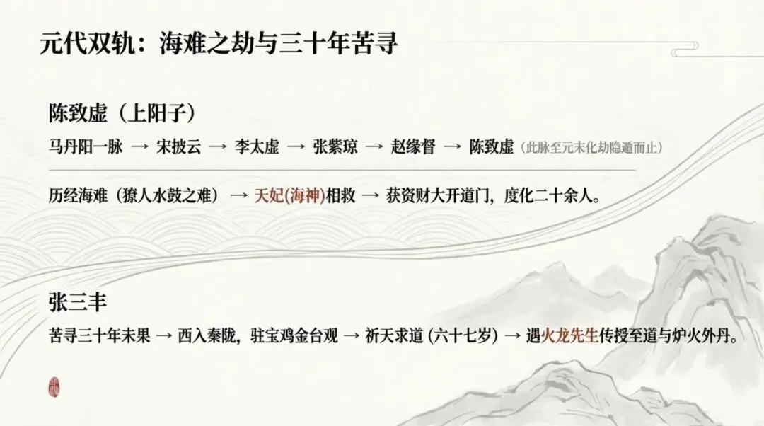 到元末顺帝至正癸未年,陈致虚名声传到朝廷,顺帝派人征召,真人知晓元朝国运将尽,预先示现化劫,遁入灵墟仙地离去。以上是马丹阳一脉的传承,至此便止传不再延续。