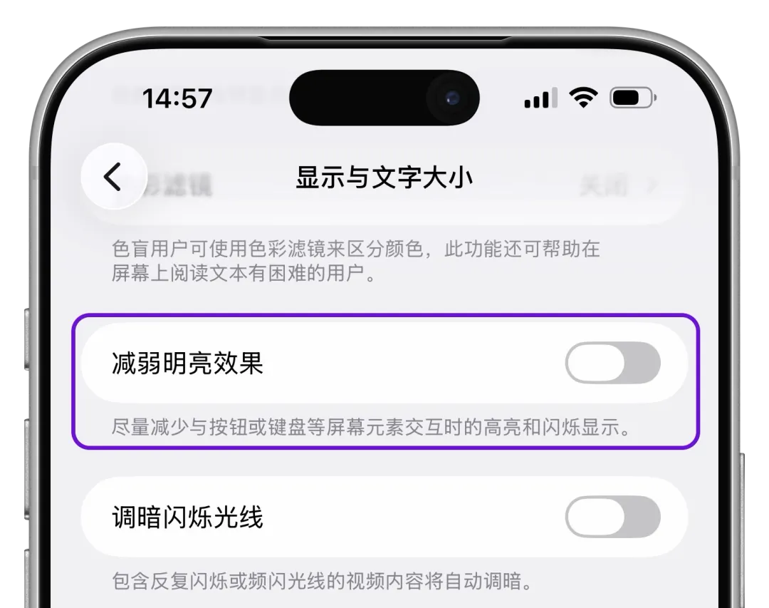 iOS 26.4 新增了「减弱明亮效果」功能开关。开关位于:辅助功能 → 显示与文字大小 → 减弱明亮效果。