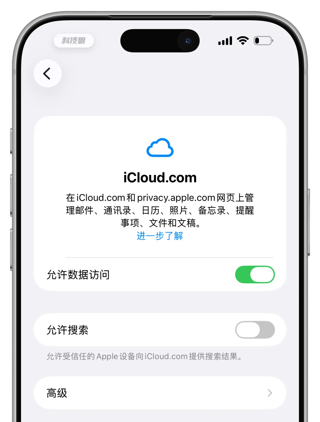 在 iPhone 设置的 Apple 账户 → iCloud 页面底部,原先的「在网页上访问 iCloud 数据」已改为「iCloud.com」 二级页面,可控制: