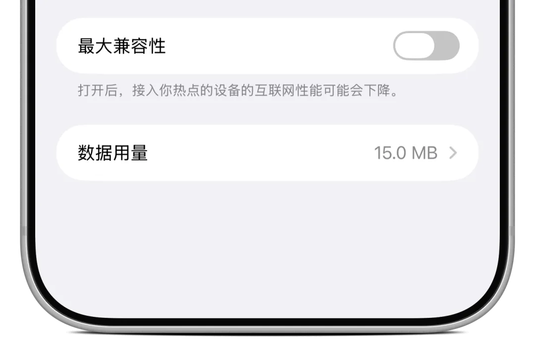 iPhone 的「个人热点」功能中,iOS 26.4 会在功能页面直接提供数据用量显示,不需要再去蜂窝网络里面查看了。