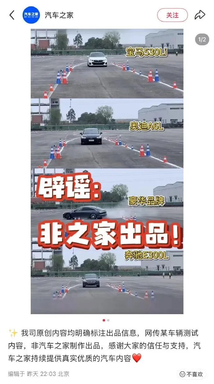 对此,汽车之家在3月24日晚进行了辟谣。“我公司原创内容均标明出品信息,网传某车辆测试内容,并非汽车之家制作出品。”汽车之家方面说道。不过,汽车之家方面未对账号被禁止关注一事做出回复。但根据外界判断,汽车之家被禁止关注,可能与其之间进行的“冬测”“智驾横评”有关。