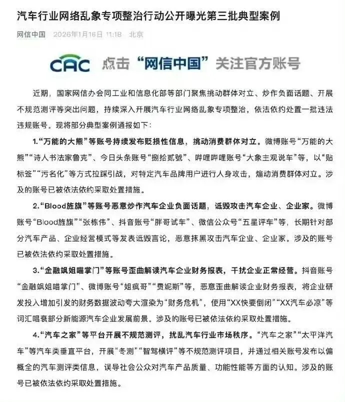 此前1月16日,中央网信办曾发布汽车行业网络乱象专项整治行动公开曝光第三批典型案例,直接点名“汽车之家”“太平洋汽车”等汽车类垂直平台,称这些平台开展“冬测”“智驾横评”等不规范测评项目,并通过相关账号发布以偏概全的汽车测评类信息,误导社会公众对汽车产品质量、功能性能等方面的认知。最后网信办还强调,涉及的账号已经被依法依约采取处置措施。