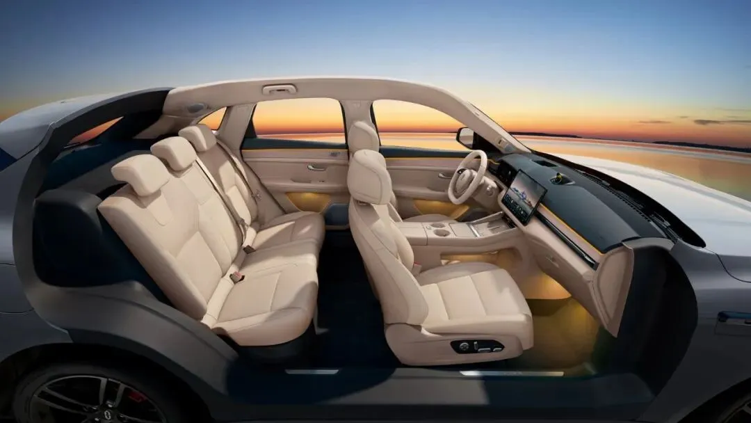 内饰设计极具创新。车内配备全液晶仪表与HUD抬头显示,核心搭载可自动转向的四维随动中控屏,可根据声源定位主动朝向主驾或副驾,交互更人性化。