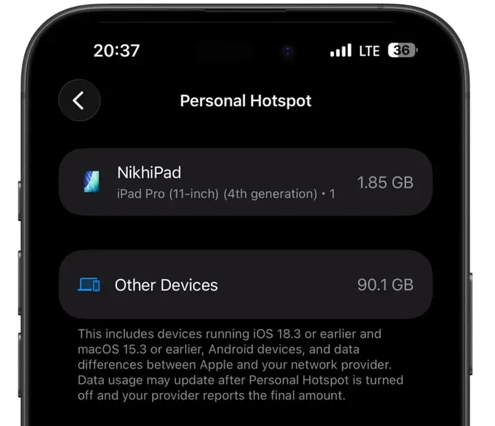 就在我为自己的迟钝连拍二十下后背时,苹果仿佛从身后按住了我的手,对我说: “别拍了。像你这种人,我们已经把同样的统计页直接搬到 设置 ⚙️ > 个人热点 🔗 里了,还顺手改名叫 数据用量。”