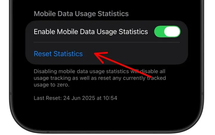 想清零统计的话,去:设置 ⚙️ > 蜂窝网络 🗼 > 重置统计数据