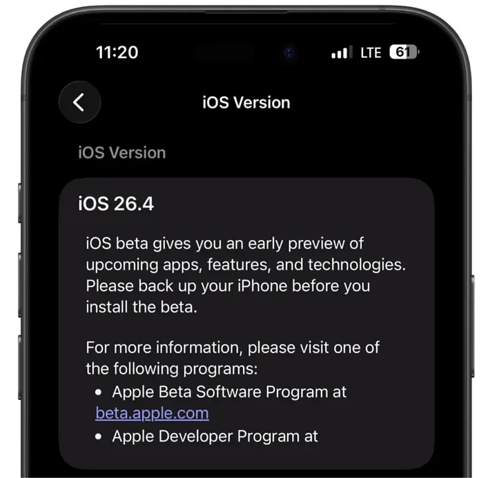 你会看到“iOS 26.4”和对应的更新日志。