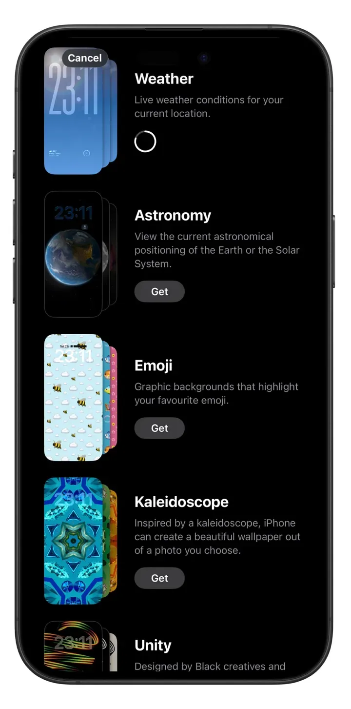而在 iOS 26.4 里,天气、天文、Emoji、万花筒、Unity 这些壁纸被挪到了苹果服务器上,只有你点“获取”时才会下载到本地。