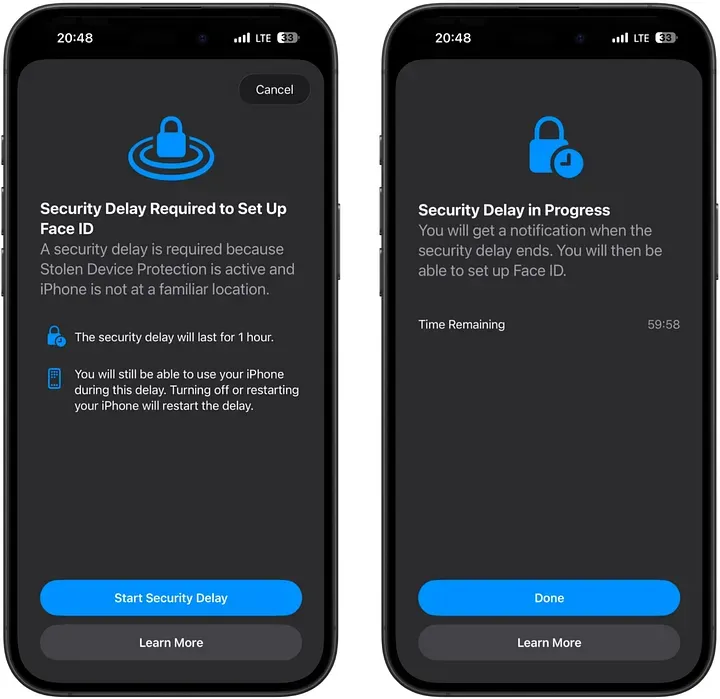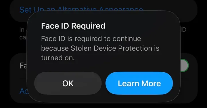 通常情况下,iOS 对很多敏感操作会先给两次 Face ID 机会;如果识别失败,再退回密码验证。 但只要开启了失窃设备保护,很多关键操作就只接受 Face ID / Touch ID,不再让密码兜底。