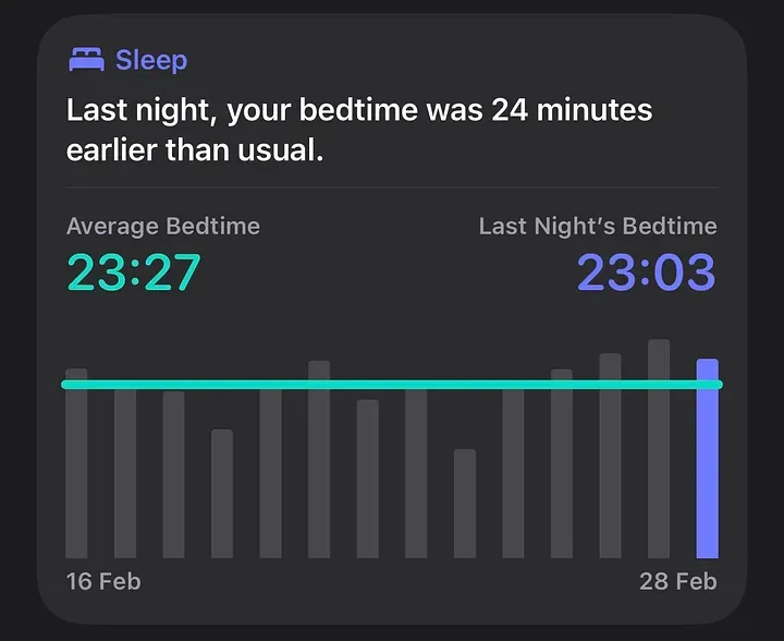 它会把你最近一次入睡前的上床时间,比如昨晚 11:30,和你过去两周的平均上床时间做比较。 这样一来,你就能更直观地看到,自己的作息有没有在变晚,以及这种变化会不会进一步影响睡眠质量。