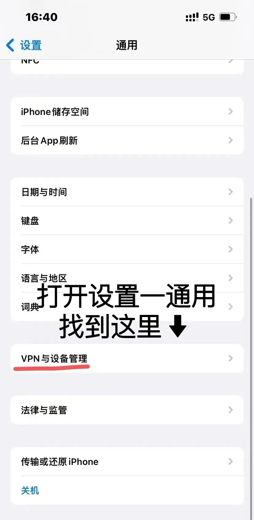 2. 在“通用”页面中,找到并点击 【VPN与设备管理】 (在部分系统版本中可能名为“设备管理”)。