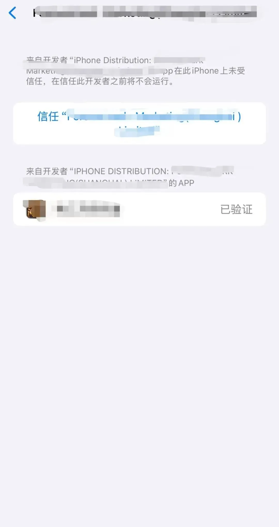 4. 点击该开发者名称,进入详细信息页面,点击蓝色的 【信任 [开发者名称]】 按钮,并在二次确认弹窗中再次选择 【信任】。
