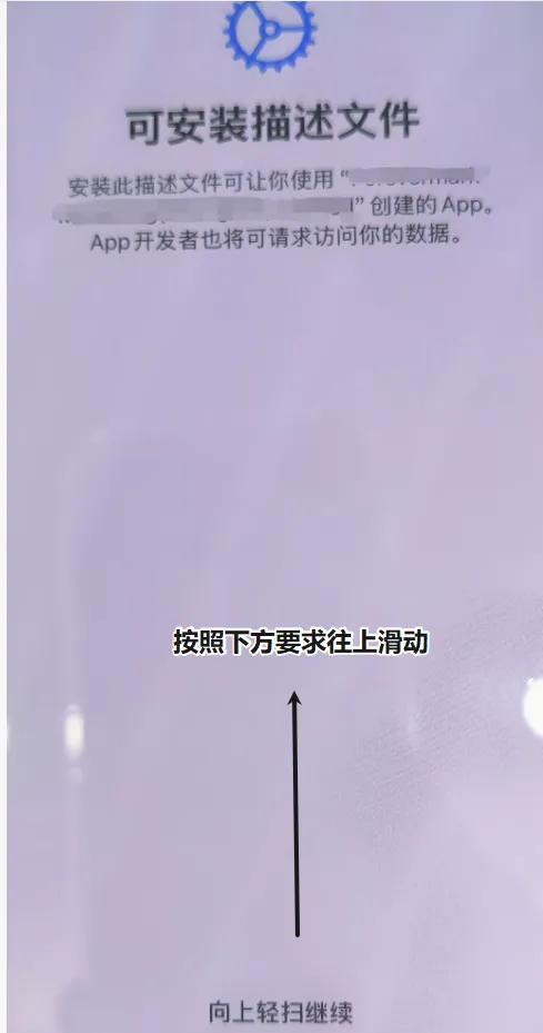 5.在苹果系统重启调整后,在弹出的弹窗中点击安装描述文件,再按照提示操作”往上轻扫继续“即可完成安装