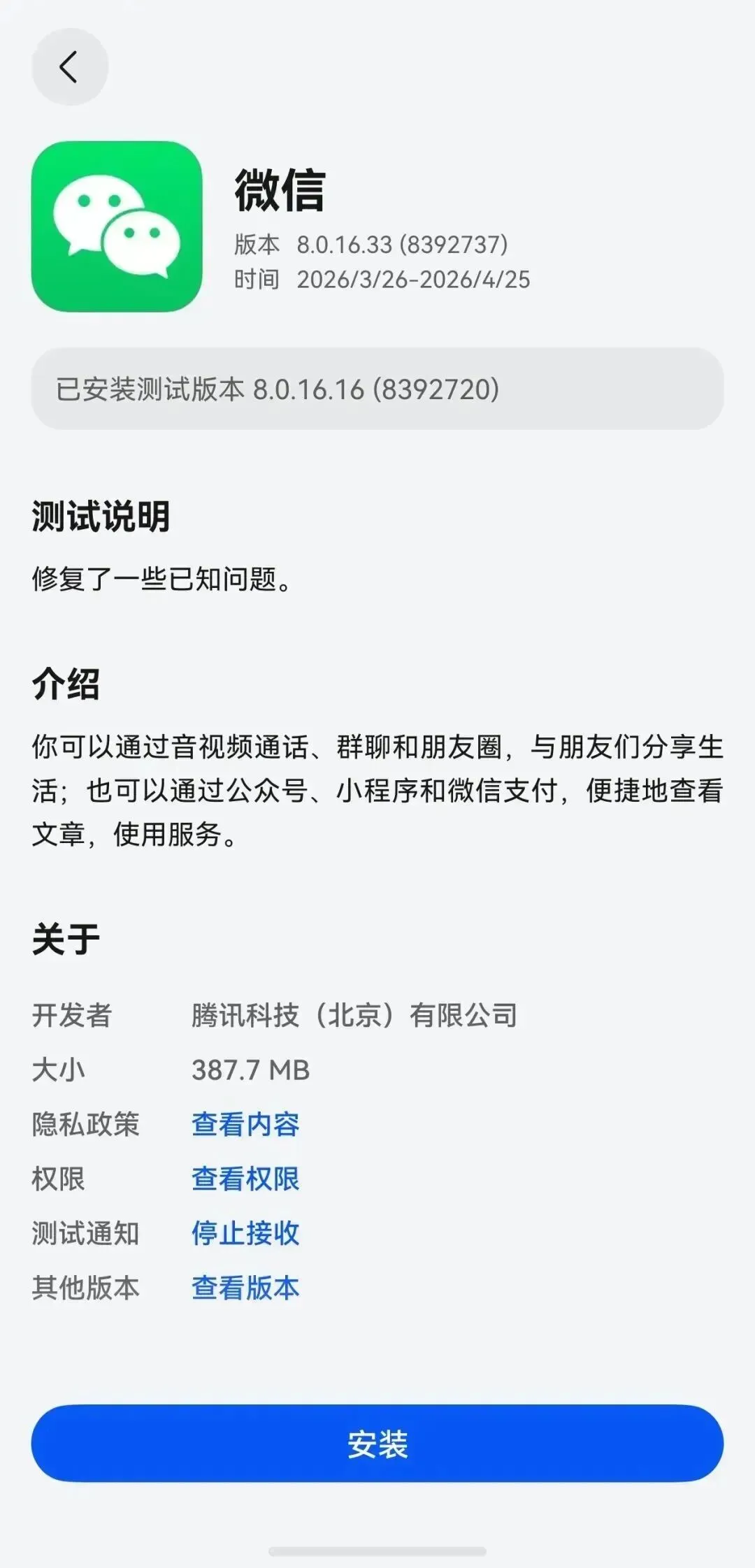 4、点击聊天输入框右边「+」按钮,新增「礼物」,订单与卡包新增「送朋友」、「礼物」栏。6、表情功能升级,新增支持互动表情;支持「最近使用」表情显示;发送红包时支持添加表情;支持表情雨特效。7、公众号主页支持展示公众号橱窗,视频号主页支持展示商品橱窗。8、支持扫码登录手表蓝牙微信/手表独立微信(暂不可用)。13、双击聊天消息文字,弹出菜单新增「分享」和「搜索」。收到鸿蒙微信 8.0.16 内测邀请的小伙伴,可以通过邀测短信、邮件,按页面提示更新,或前往华为鸿蒙应用市场「我的-应用尝鲜」、AppTest 中直接更新。-------------------------声明--------------------