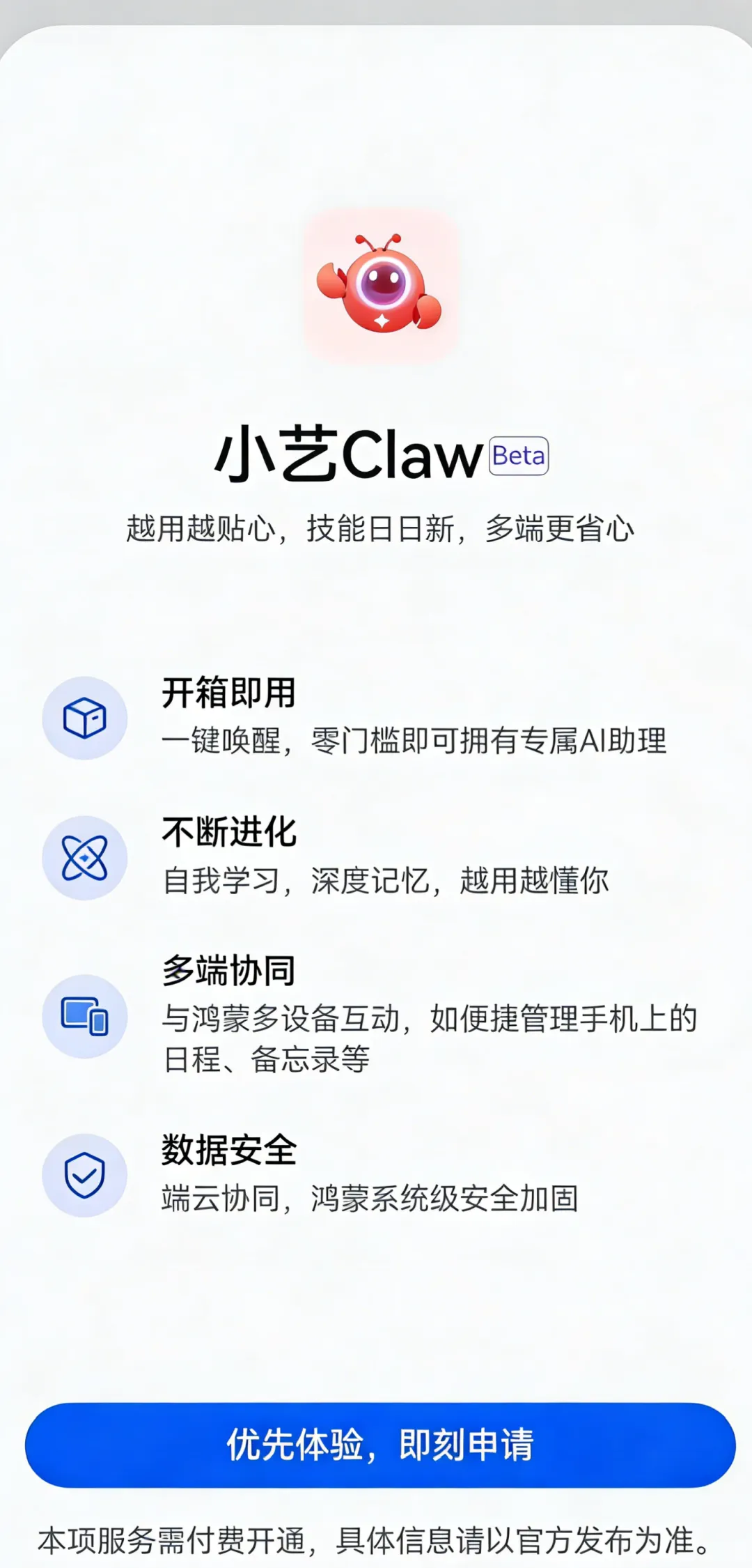3 月 25 日消息,华为鸿蒙手机专属的“龙虾”——小艺 Claw 已正式开启预约通道,全程适配 HarmonyOS 6 系统,覆盖手机、平板两大主流设备,鸿蒙用户可快速参与预约,抢先体验全新智能助手服务。