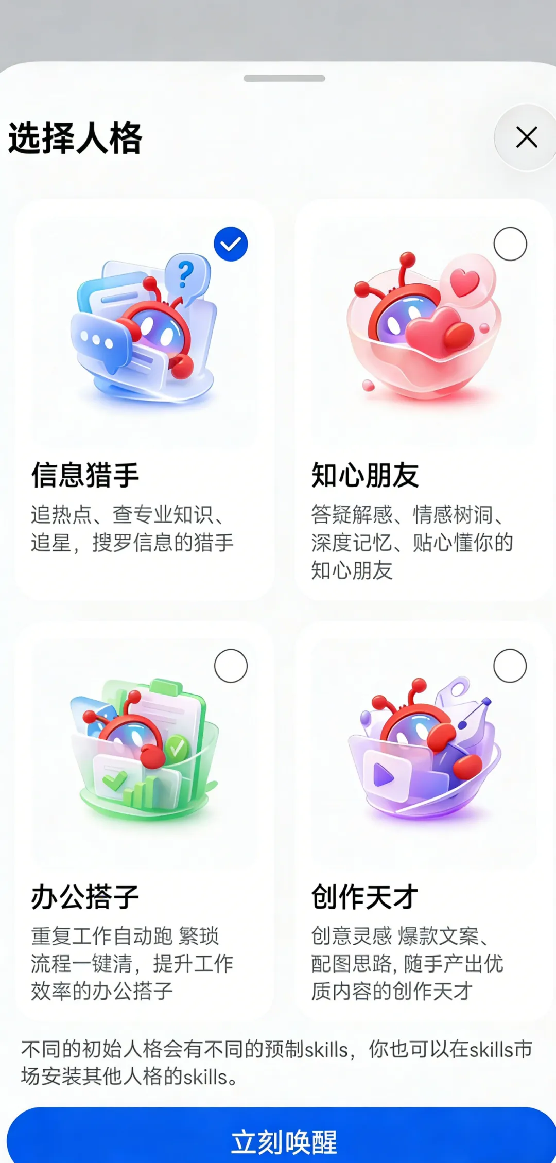 值得一提的是,小艺 Claw 支持多人格切换,不同初始人格配备不同的预制 Skills,满足用户多样化使用需求;同时,用户还可在 Skills 市场自由安装其他人格的 Skills,自定义打造专属智能助手。