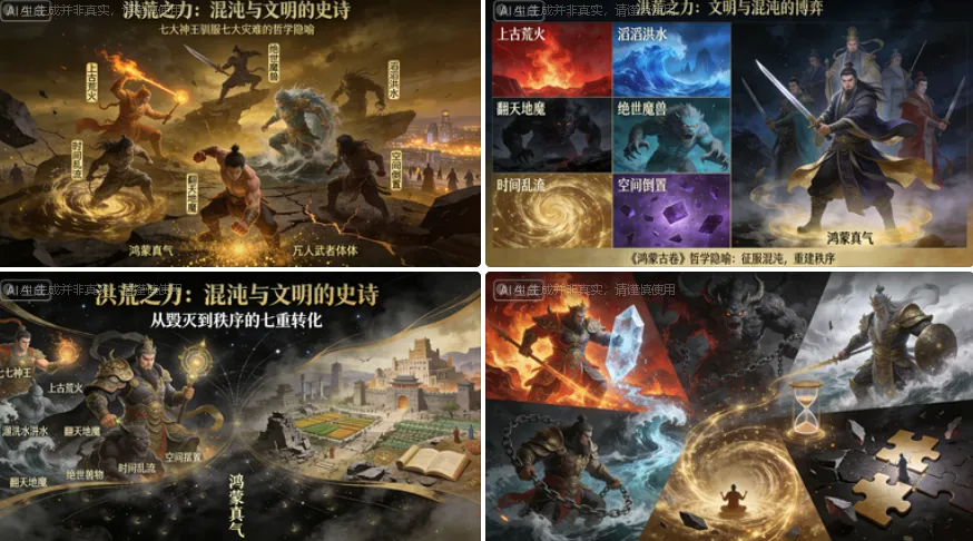 七大神王战胜七大洪荒之力的过程,象征着人类用智慧、勇气与协作,将自然的狂暴力量(荒火、洪水)、地理的剧烈变动(地魔、地火)、生物的本能野性(魔兽)乃至时空的无序(时间乱流、空间倒置)逐一纳入可控的文明框架。而当神王逝去,这些被驯服的力量并未消失,而是化为天地间弥漫的“鸿蒙真气”,成为凡人武道修习的源泉。这暗示着,曾经作为外部威胁的“洪荒之力”,最终内化为了文明自身演进与个体自我超越的内在驱动力。人类的历史,就是不断直面混沌、吸收混沌,并最终从混沌中汲取秩序与力量的历史。这一思想高度,使得《鸿蒙古卷》超越了一般奇幻设定的娱乐范畴,触及了人类文明本质的深邃思考。